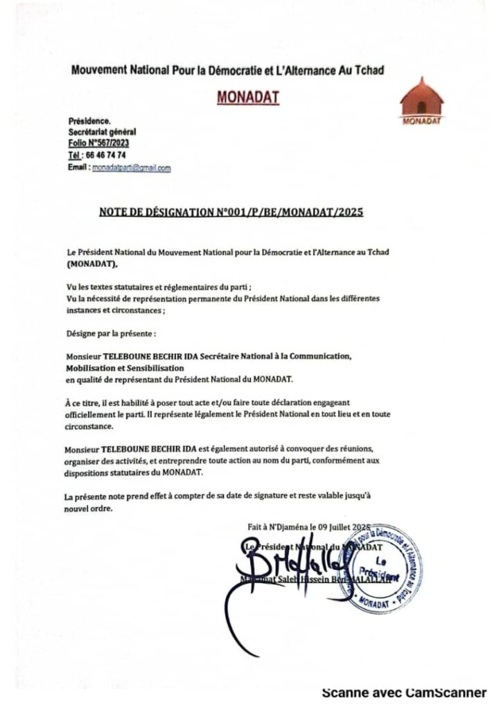 Par une note de désignation officielle (N°001/P/BE/MONADAT/2025) datée du 9 juillet 2025, le Président National du Mouvement National pour la Démocratie et l’Alternance au Tchad (MONADAT), M. Mahamat Saleh Hussein Brahim, a désigné M. Teleboune Bechir Ida, Secrétaire National à la Communication, Mobilisation et Sensibilisation, comme représentant légal du Président du parti.